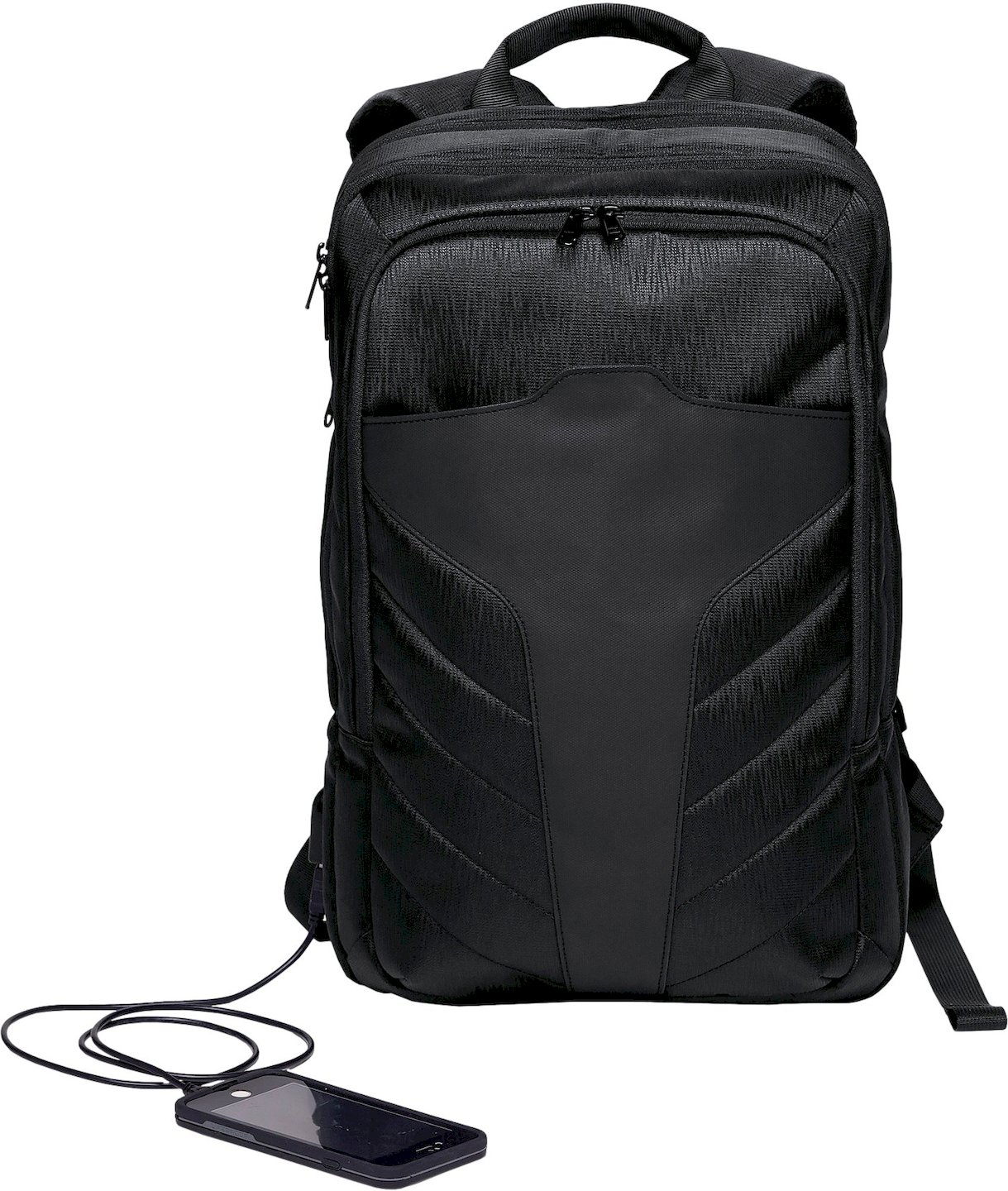 FeaturesExternal USB charger port with integrated internal cable to charge your deviceFour main zippered fully cell foam padded universal storage compartments with 15.6” laptop compartmentZippered passport/security pocket on lumber back panelFoam padded top grab handleMesh backed padded shoulder straps and contoured padded mesh back panelsHands free mobile/media suction cup panel on shoulder strapBack webbing panel can slip over wheeled bag handle