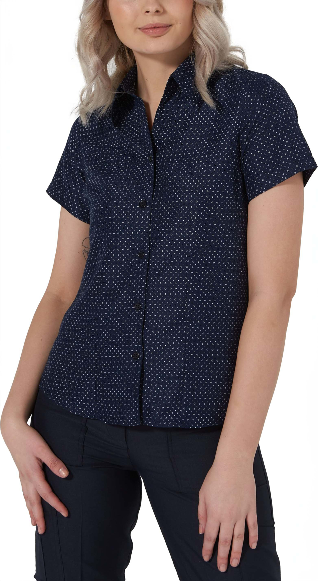 The ladies' short sleeve semi-fitted shirt in White/Navy Flinders Print is a stylish and versatile garment designed to provide both comfort and a fashionable look. Made from breathable polyester fabric, this shirt offers functionality and breathability, making it ideal for active days or warm weather. The semi-fitted silhouette of the shirt strikes a balance between a relaxed fit and a tailored appearance. It skims the curves of the body without being overly tight, offering a flattering and comfortable shape. This design choice ensures freedom of movement and a polished aesthetic.