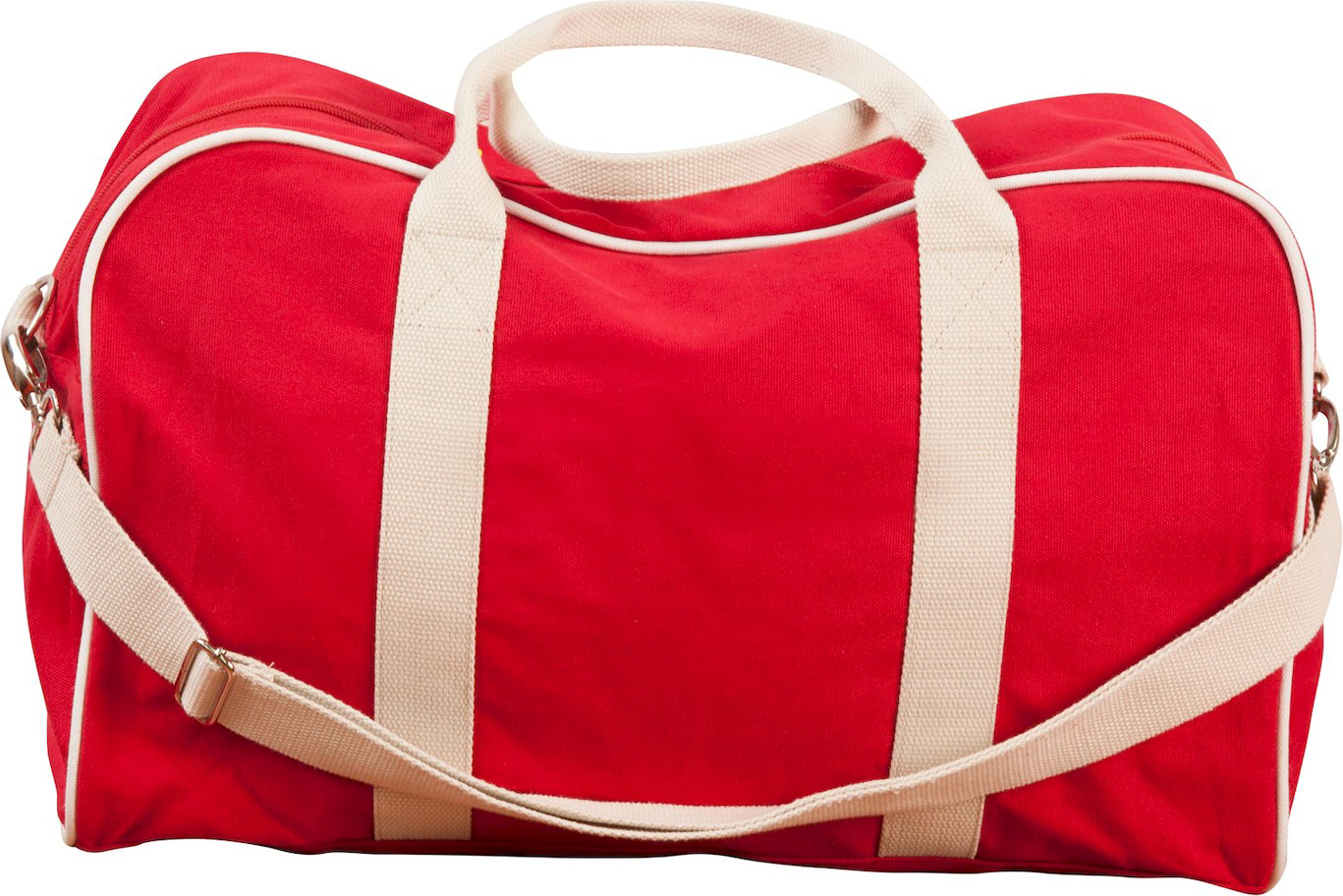Canvas with contrast colour strap, carry handles and piping. One large main compartment with zip closure